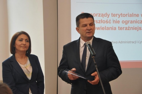 Prelekcję zatytułowaną "Przyszłość polskiego samorządu terytorialnego” wygłosił Szymon Wróbel. Dyrektor Departamentu Współpracy z Jednostkami Samorządu Terytorialnego w Ministerstwie Administracji i Cyfryzacji zwrócił uwagę, że Rok Samorządności sprzyja podsumowaniom, ale także spojrzeniu w przyszłość. Wszyscy się zgodzimy -mówił dyrektor Sz. Wróbel - reforma samorządowa jest naszym polskim sukcesem, ale to co nasz czeka w przyszłości, będzie miało wpływ na administrację. Do kluczowych czynników należy zaliczyć m.in.: perspektywę finansową UE na lata 2020-2025, demografię, przemiany społeczne, rozwój techniki i kondycję gospodarki. Dlatego dziś ważne jest pytanie: jakimi środkami będą dysponować samorządy i dla kogo będą świadczyć swoje usługi? Nie należy zapominać przy tym, że w obliczu rozwoju, rosną oczekiwania wobec samorządu - coraz częściej społeczeństwo chcę się angażować i mieć wpływ na to, co dzieje się we wspólnotach lokalnych.