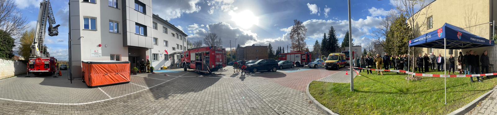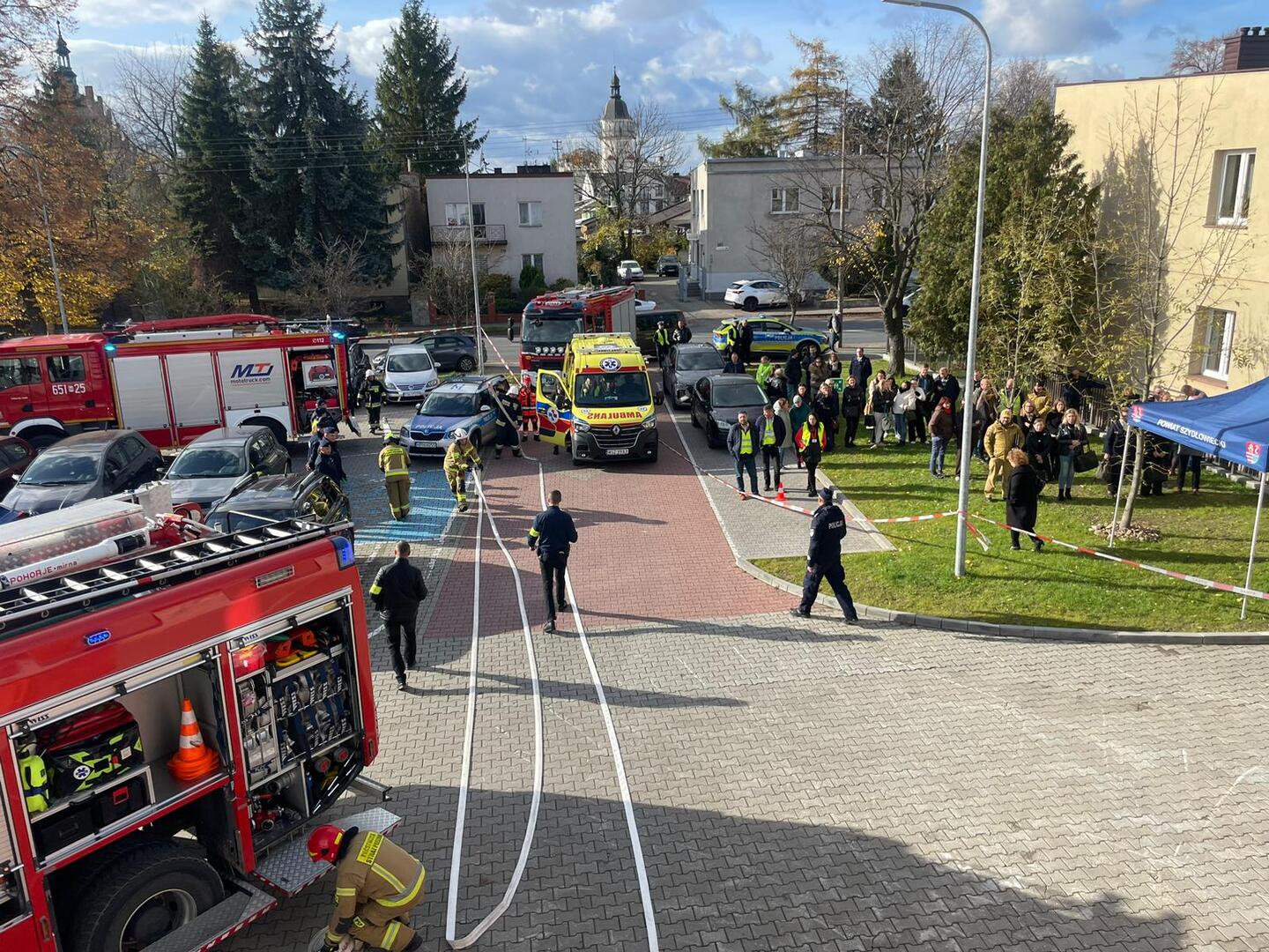 29 października 2025 r. w ramach epizodu praktycznego powiatowego ćwiczenia obronnego pod kryptonimem „SZYDŁOWIEC 2025” przeprowadzono działania w budynku Starostwa Powiatowego przy ul. Kościuszki 170, które były kluczowym testem gotowości służb oraz procedur ewakuacyjnych. Scenariusz zakładał ujawnienie niezidentyfikowanego pakunku, będącego efektem aktu sabotażu, który spowodował pożar w pomieszczeniach urzędu – szybkie rozprzestrzenianie się dymu wymusiło natychmiastową ewakuację pracowników oraz petentów. Akcję koordynował Starosta Szydłowiecki, przy współpracy ze służbami: PSP, Policji oraz SPZZOZ. Po ewakuacji i weryfikacji obecności wszystkich osób, służby ratownicze przeprowadziły działania gaśnicze oraz wsparcie medyczne dla poszkodowanych. Policja zabezpieczała teren i prowadziła negocjacje z osobą, której zachowanie wskazywało na celowe wywołanie zagrożenia. Dzięki współpracy wszystkich służb, również z udziałem psychologa, sytuacja została opanowana i zakończona sukcesem. Ćwiczenie pozwoliło sprawdzić oraz doskonalić organizację przepływu informacji, koordynację działań oraz znajomość procedur w sytuacji kryzysowej, szczególnie ważnej dla kierownictwa urzędu oraz wszystkich uczestników ewakuacji.