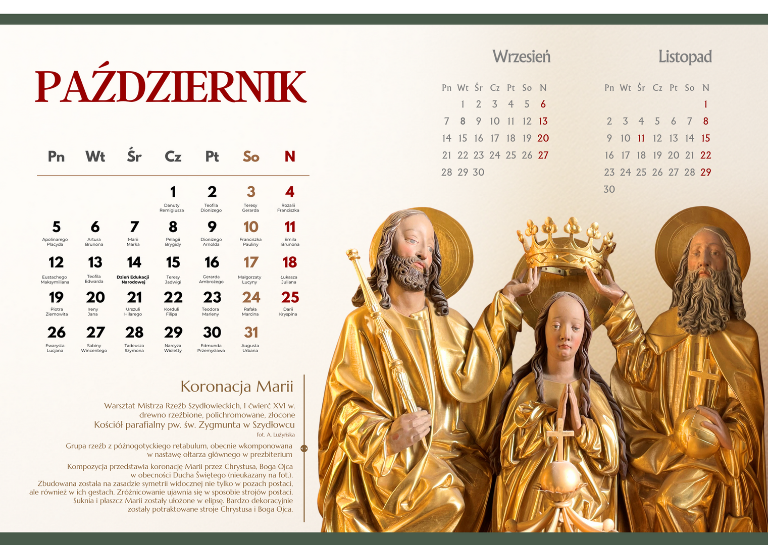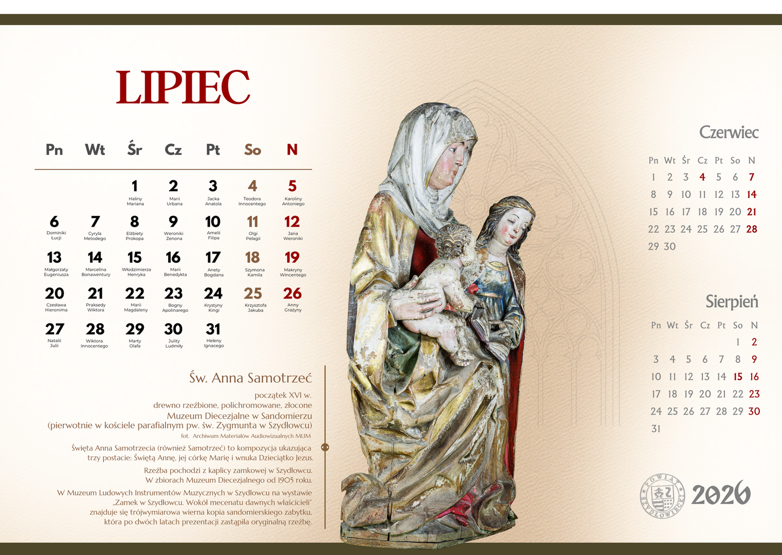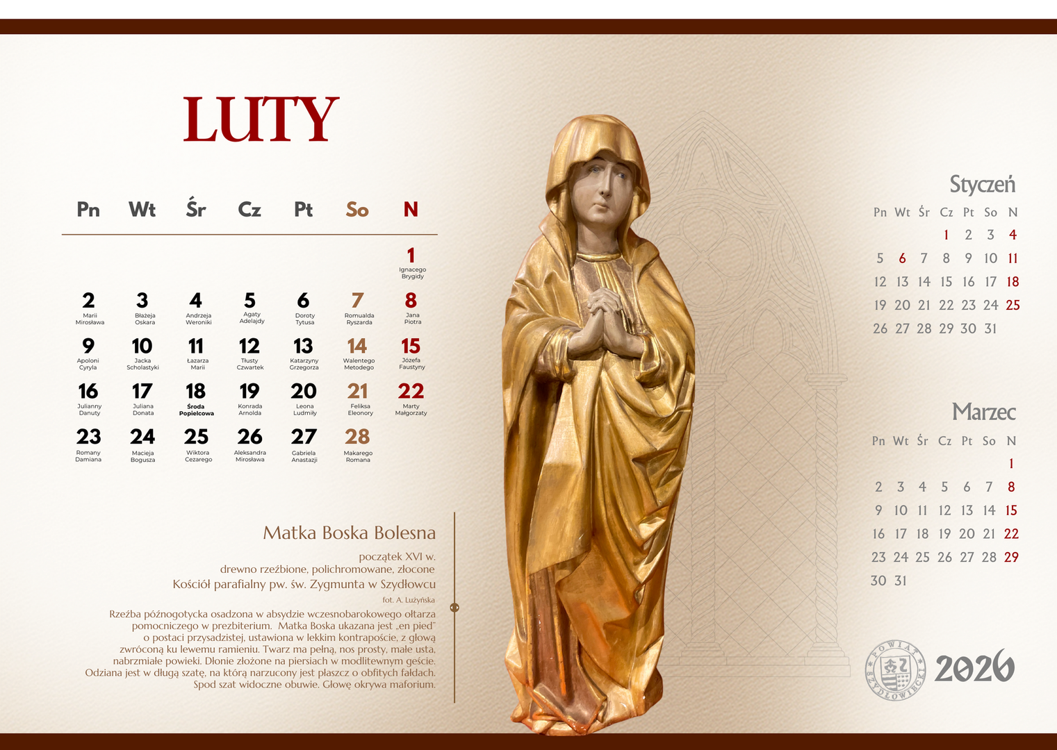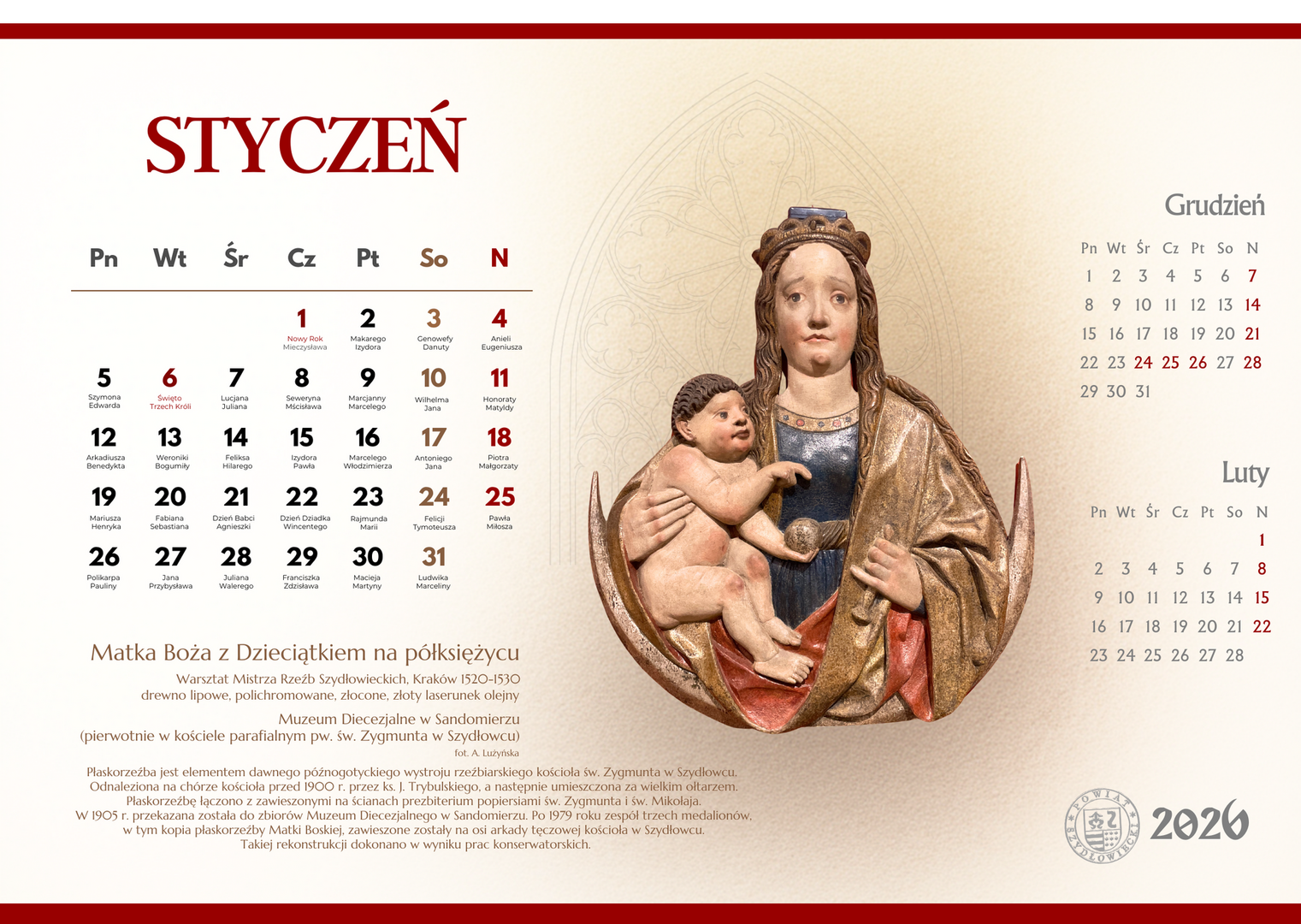 Karty kalendarza Powiatu Szydłowieckiego na 2026 rok zdobią wizerunki zabytków rzeźby i malarstwa tablicowego datowane na XV i XVI wiek.