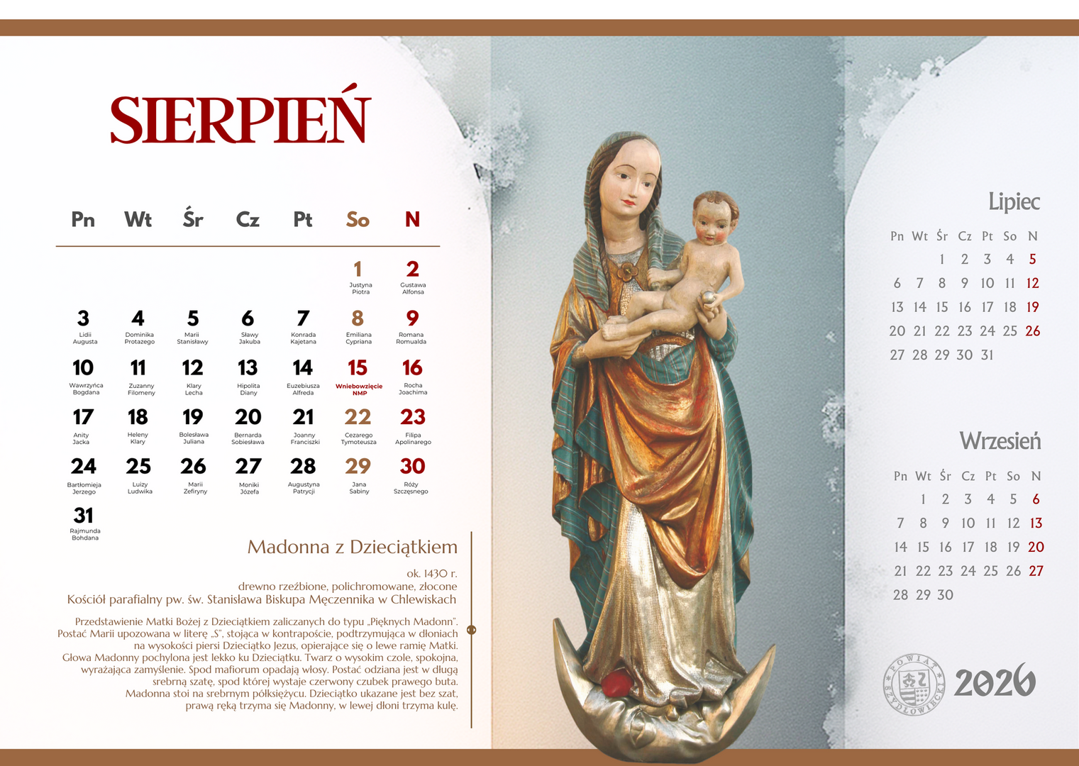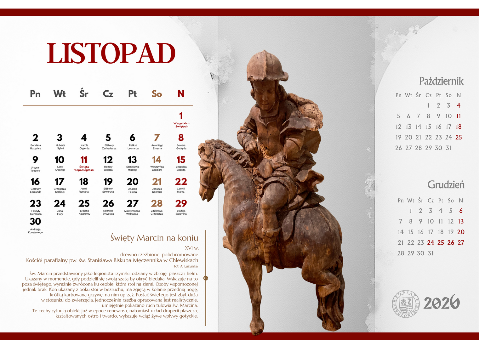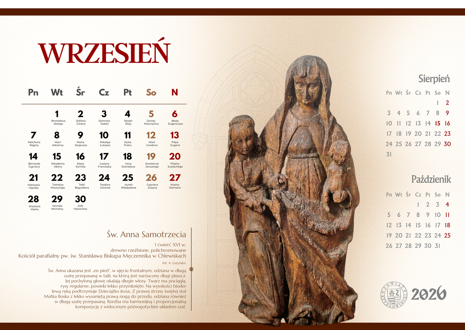 Karty kalendarza Powiatu Szydłowieckiego na 2026 rok zdobią wizerunki zabytków rzeźby i malarstwa tablicowego datowane na XV i XVI wiek.